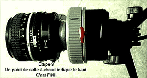 8) Poser et centrer la plaquette coté cuivre vers l'extérieuren utilisant un objectif et soit en regardant par l'objectif soiten faisant un point au marqueur à l'eau bien au centre de lalentille arrière pour s'aider. Coller le CI support sur lesentretoises à la super glue.