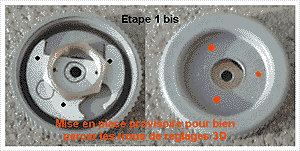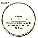 6) Percer les trous separés de 22.5mm où passeront les vis demaintien (1.3 à 1.4mm) et le trou central (diam. 6mm). Tarauderles trous avec les vis en forcant leur passage (délicat). Lisserle gros trou au forêt de 9mm des deux côtés.