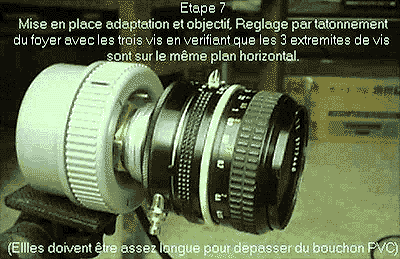 Les explications sont inclues dans les images. C'est une réalisationplus longue mais plus précise que la première qui restecependant valable. La nouvelle version permet un positionnement 3Dprécis et ajustable à tout moment par trois écrous de laposition du capteur sur l'axe optique. Ainsi on peut s'adapterfacilement à des types de lentilles différentes. J'ai realisédes essais avec une optique video surveillance de 4mm donnant untrès grand champ, un objectif de vs de 16mm et un objectifNikkon de 50 mm qui me semble bien adapté pour l'eclipse.