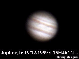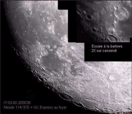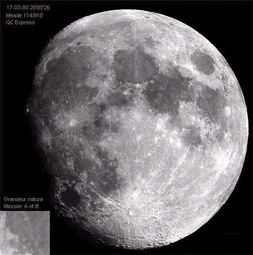 | QuickCam Express adaptée (au coulant 31.5mm) directement sur une lentille de Barlow Ultima placée derrière un C8 sur monture Perl Vixen SP. Fichier AVI de 30 secondes a partir duquel 2 images ont été extraites (avec AVIedit) puis léger traitement et compositage sous PhotoShop5. | ||
